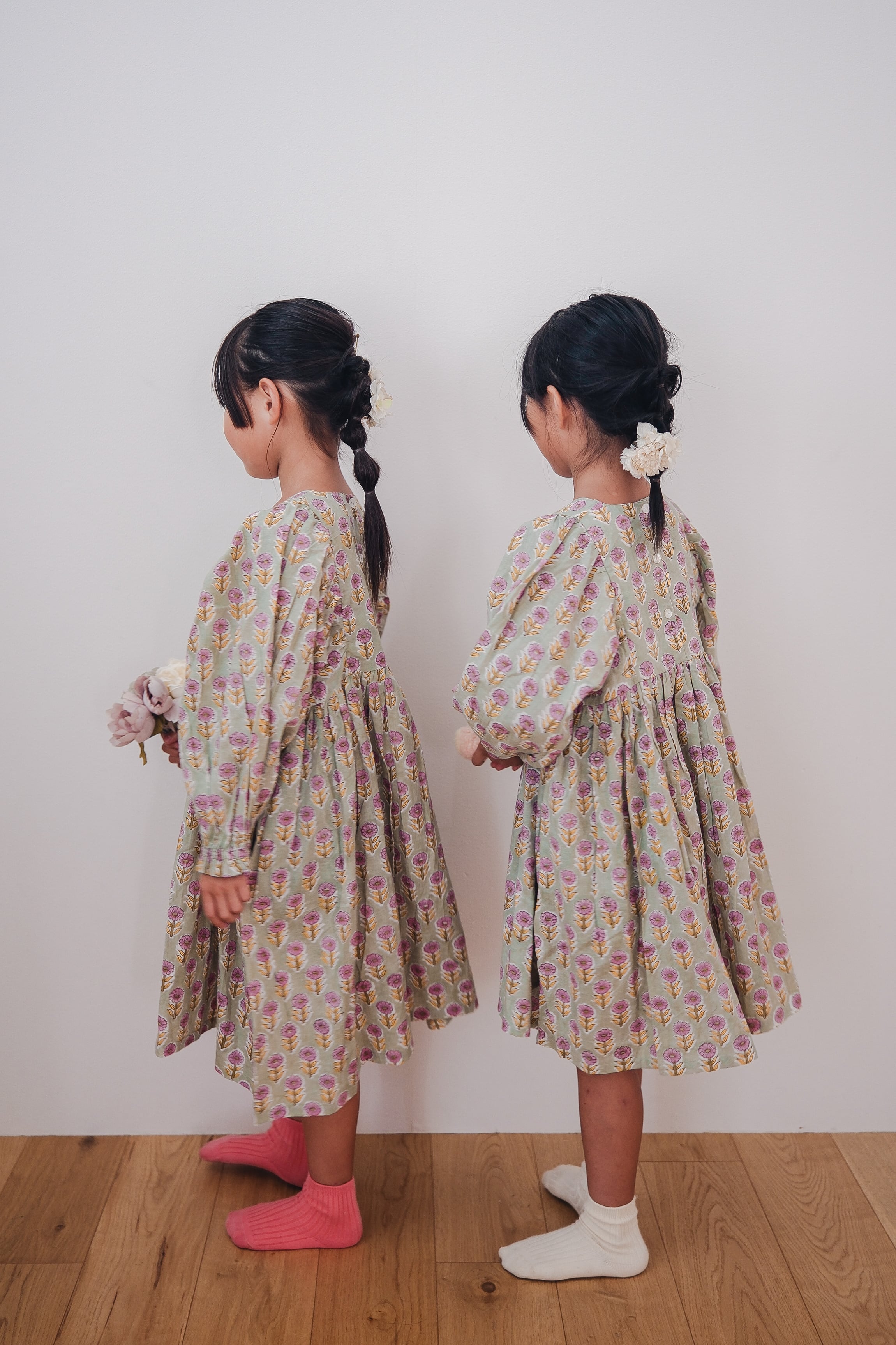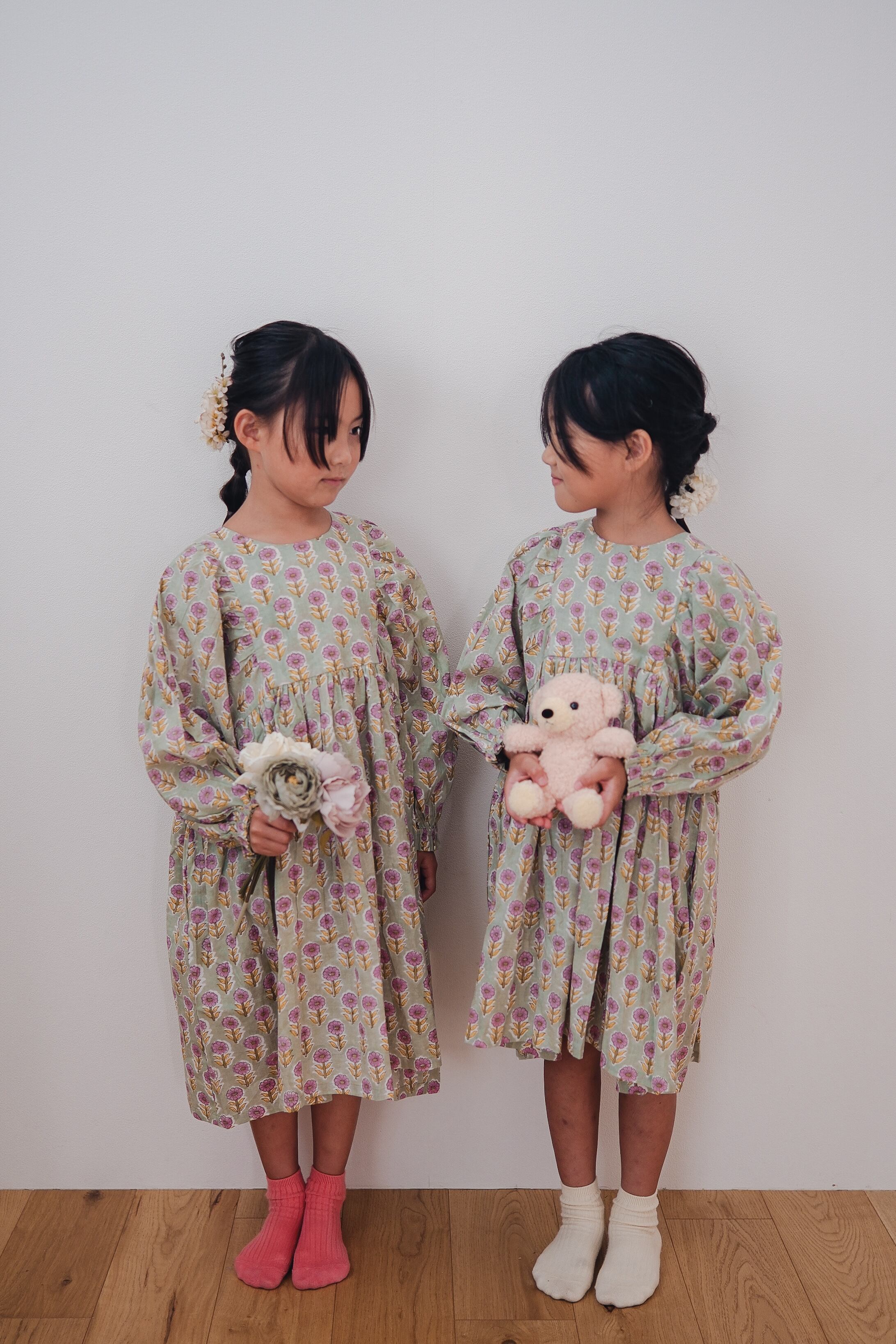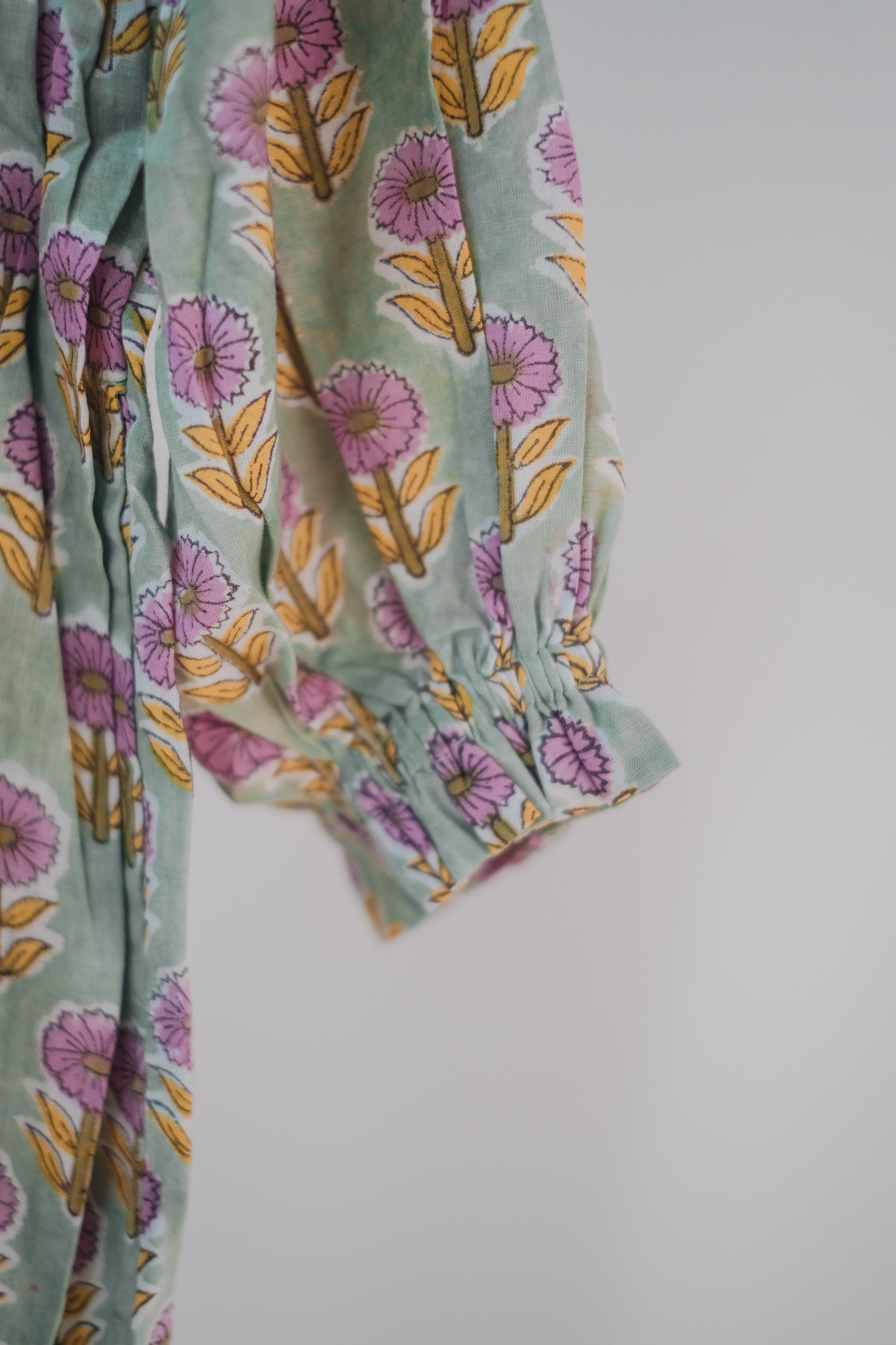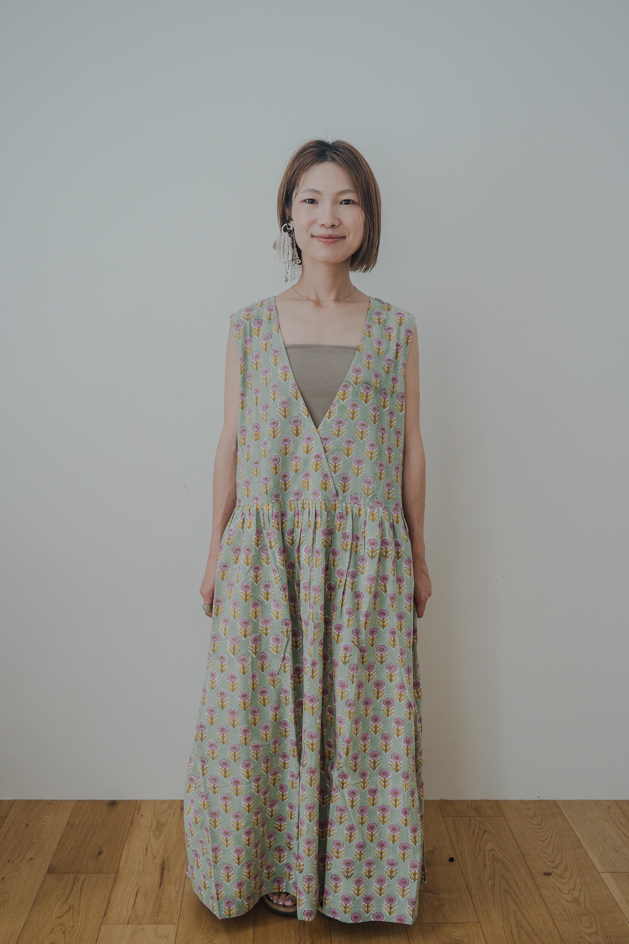 生地には、インドの職人が木版を一版ずつ手で押して染め上げるブロックプリントを使用。