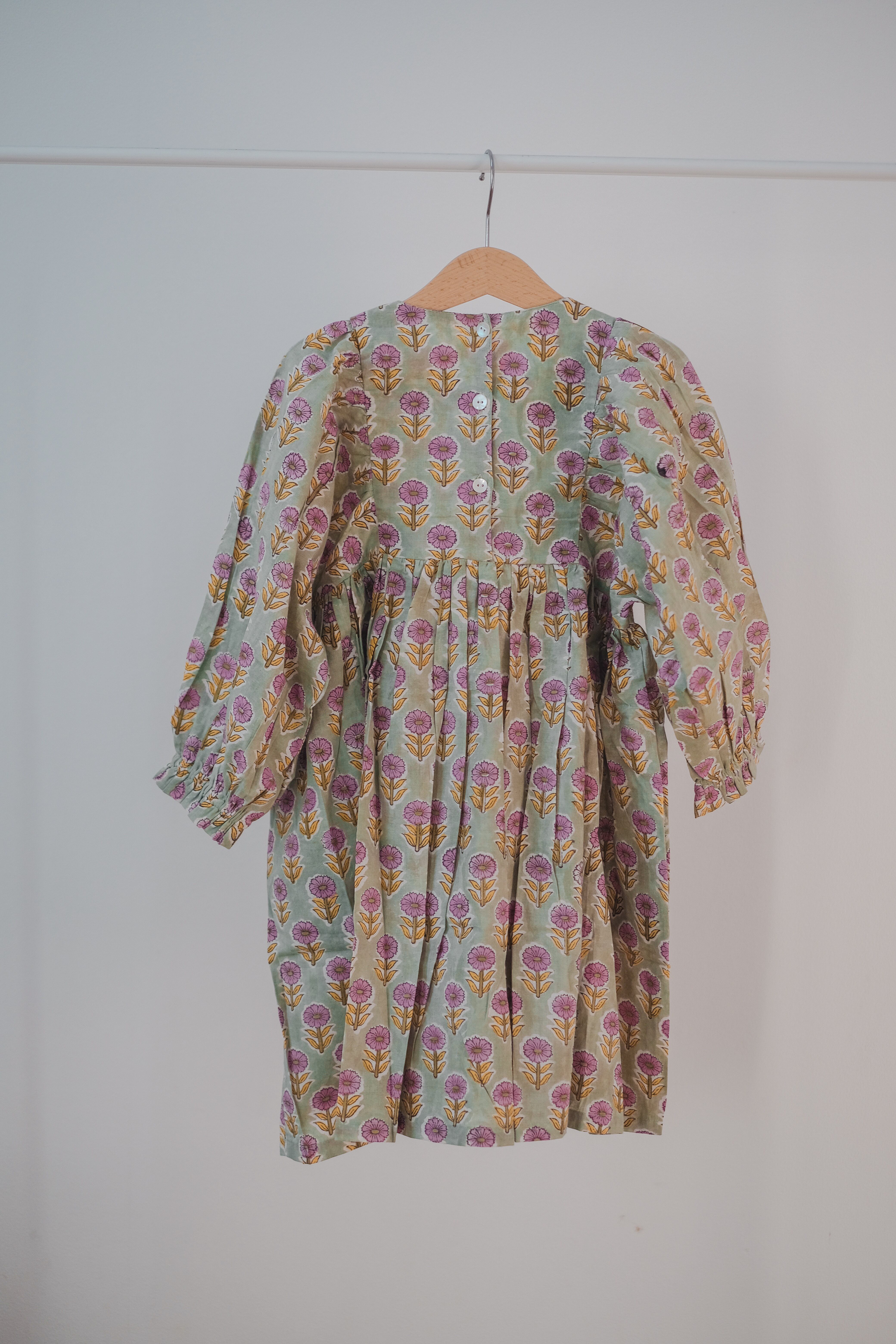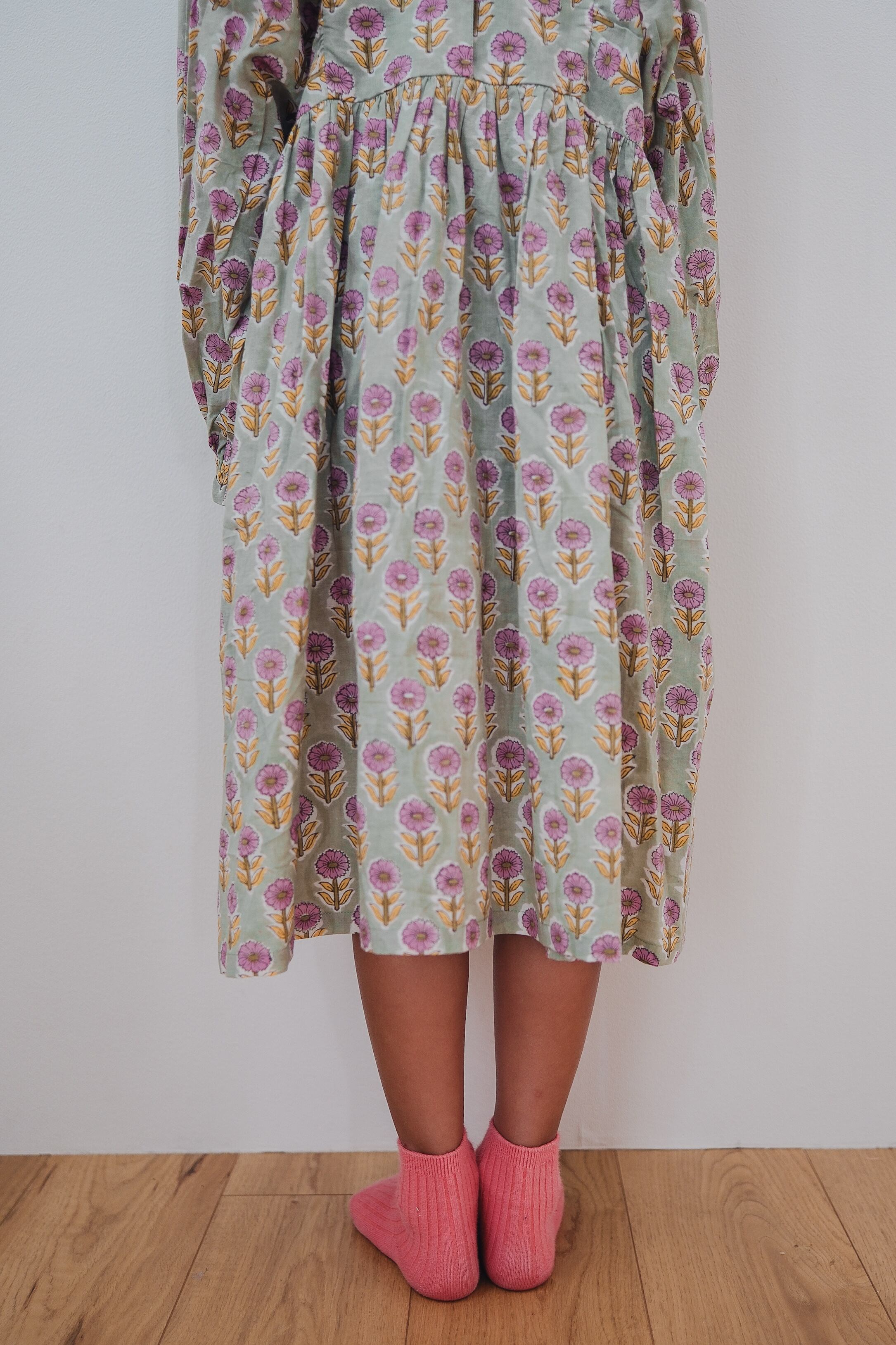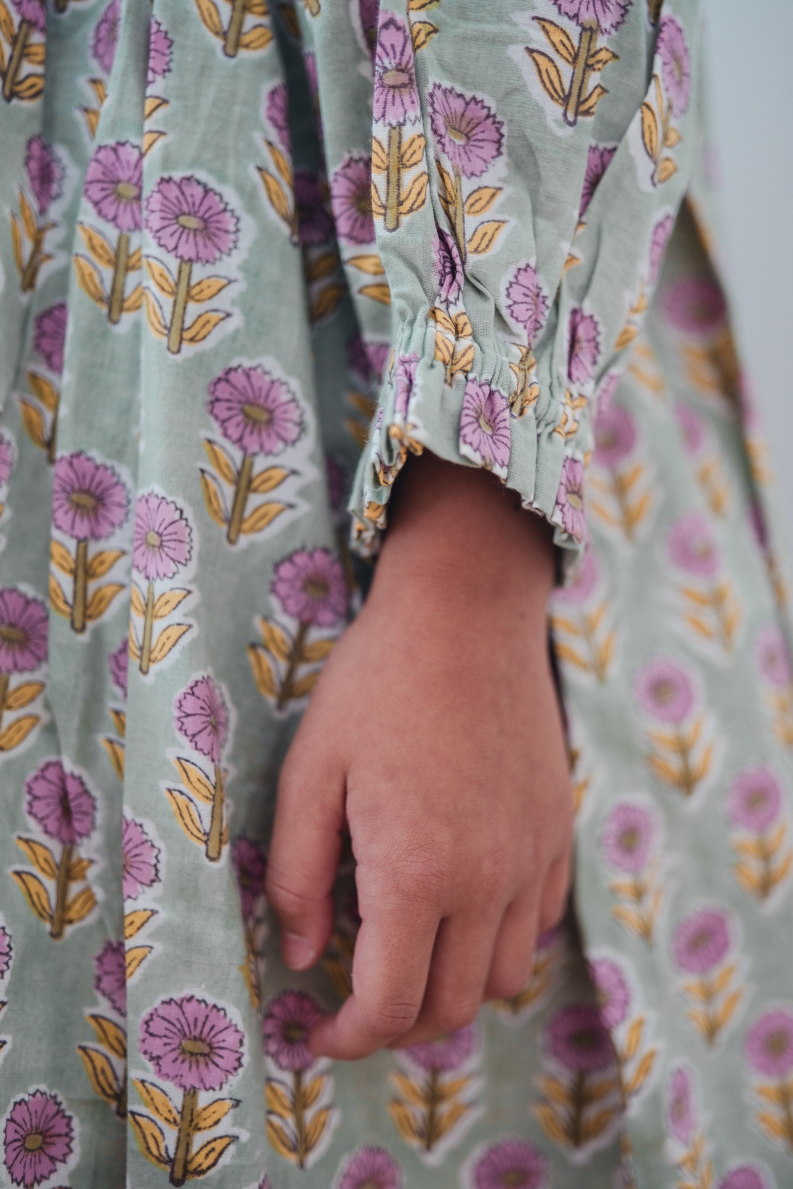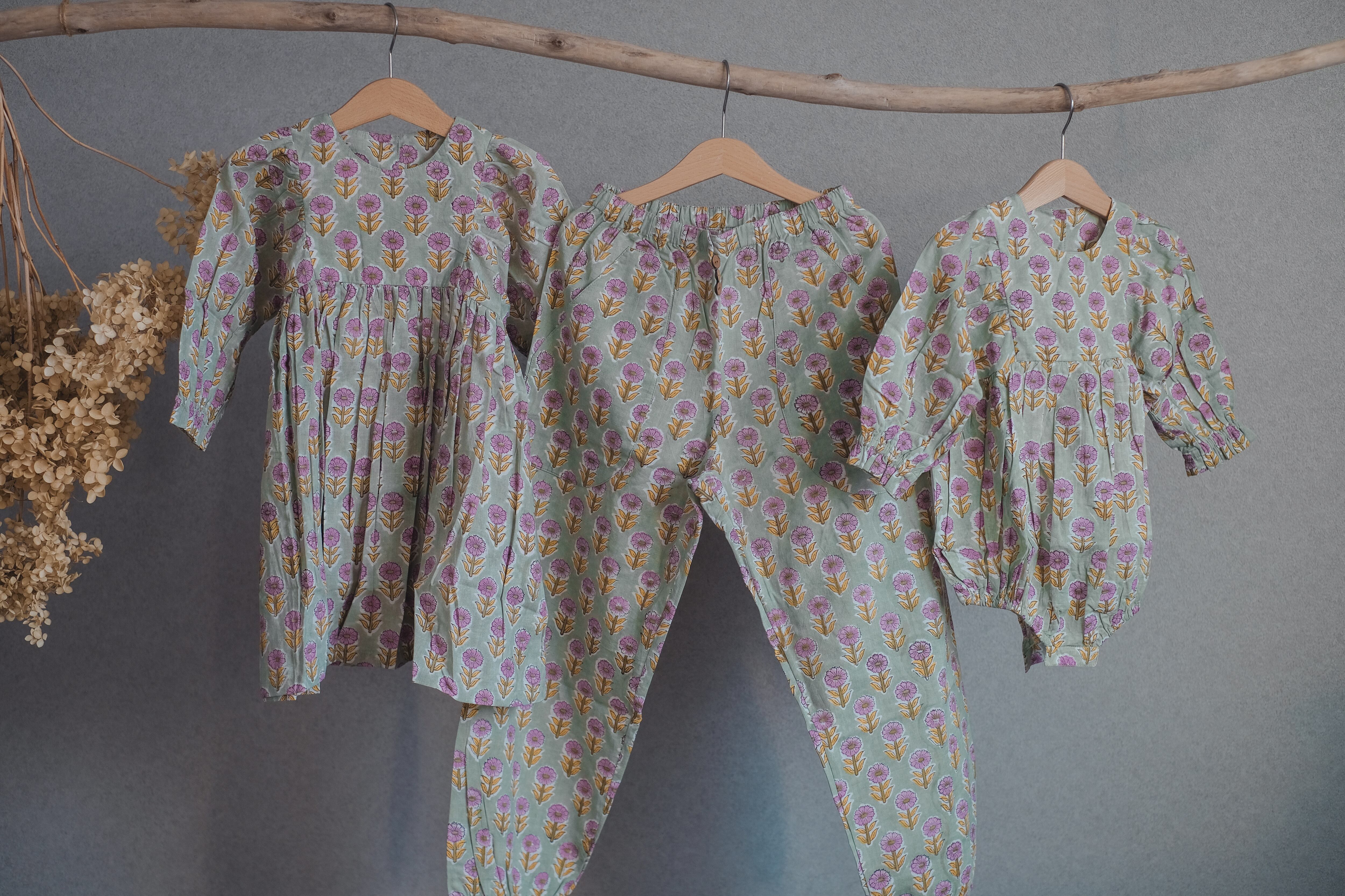 生地には、インドの職人が木版を一版ずつ手で押して染め上げるブロックプリントを使用。