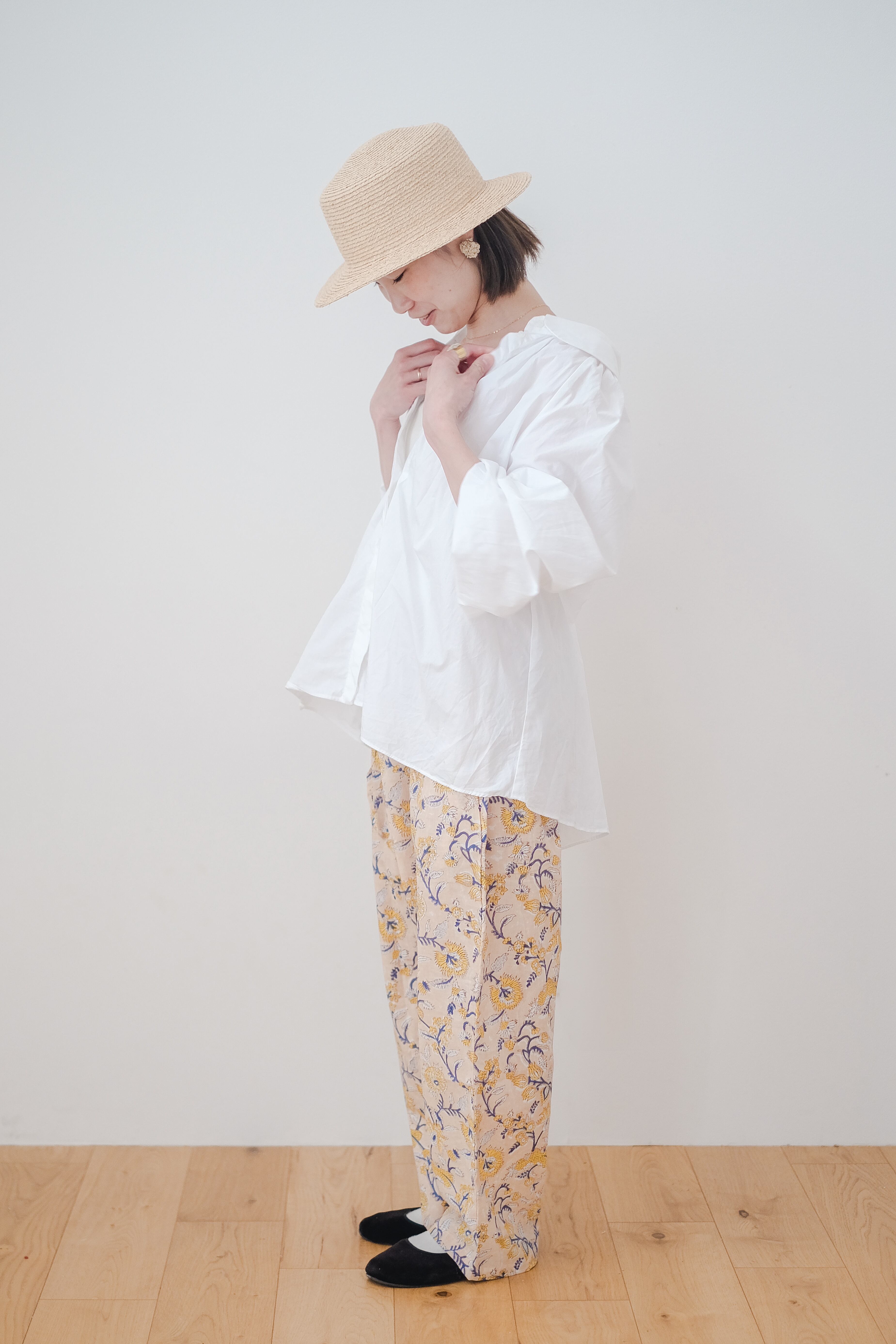ヒップまわりはゆったり、裾にかけて細くなるテーパードシルエット。