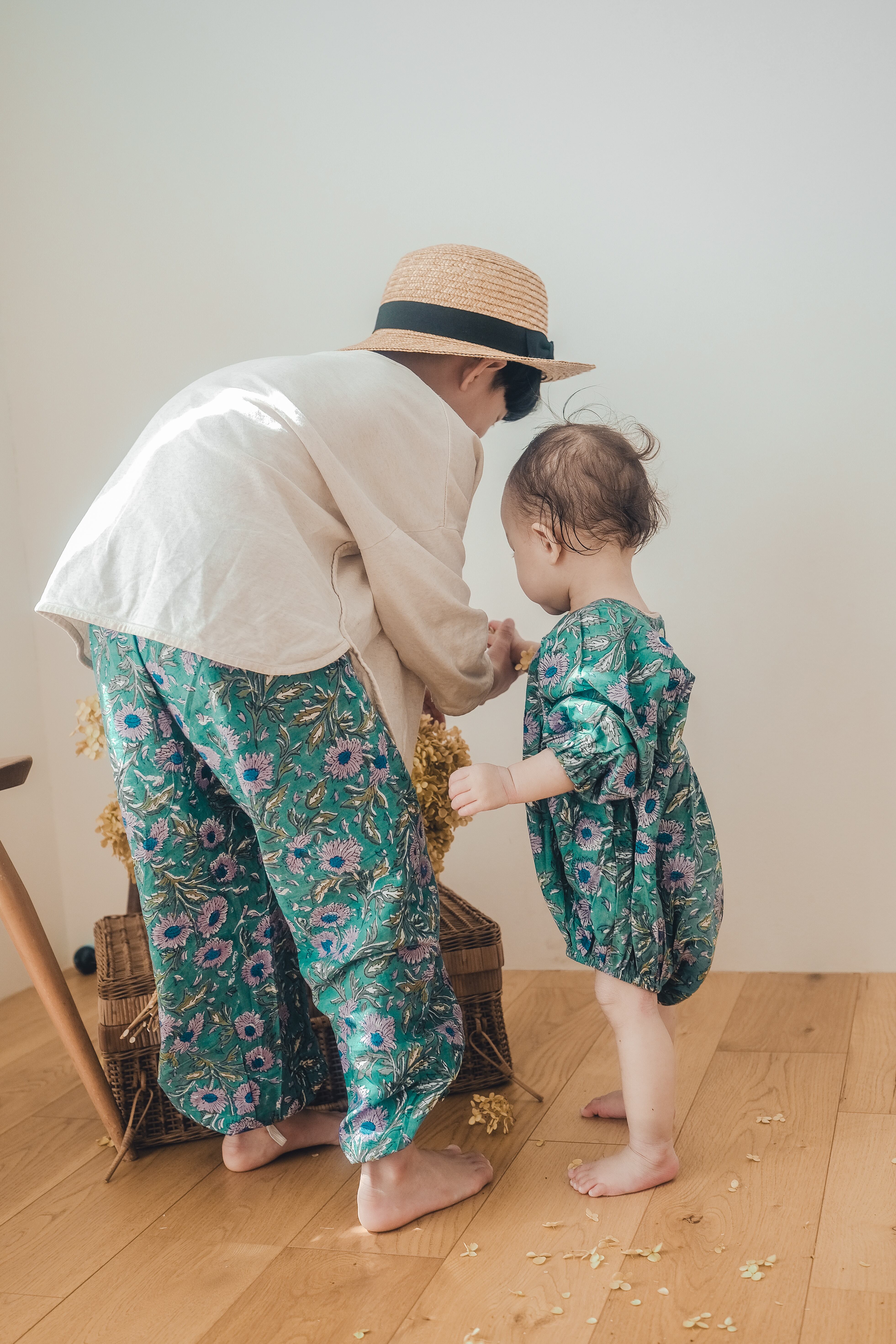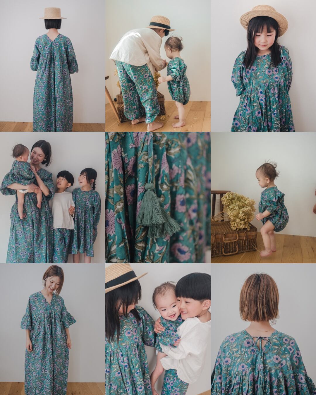 落ち着いたグリーンは、大人服との相性も良く、リンクコーデに取り入れやすいカラーです。