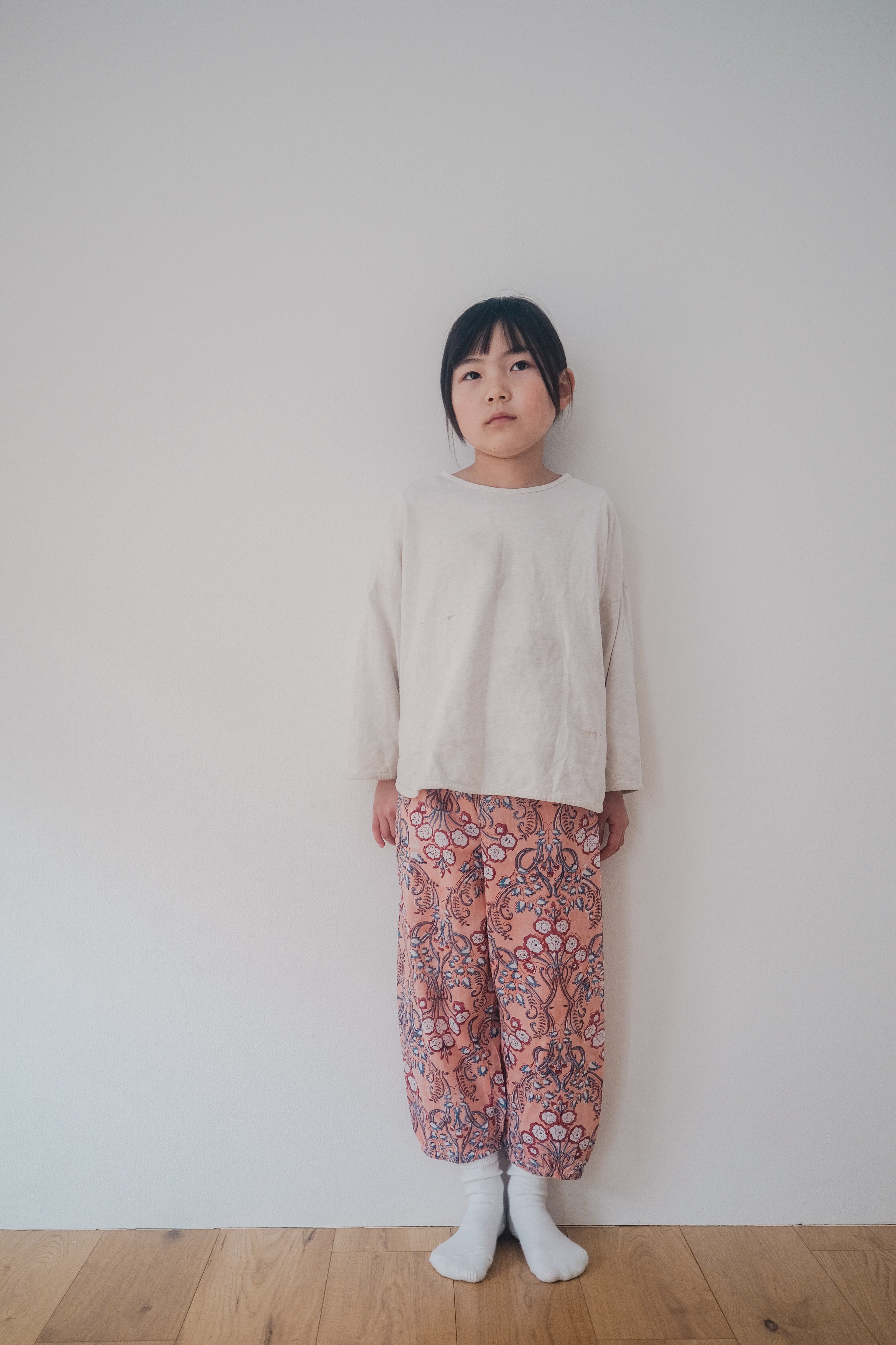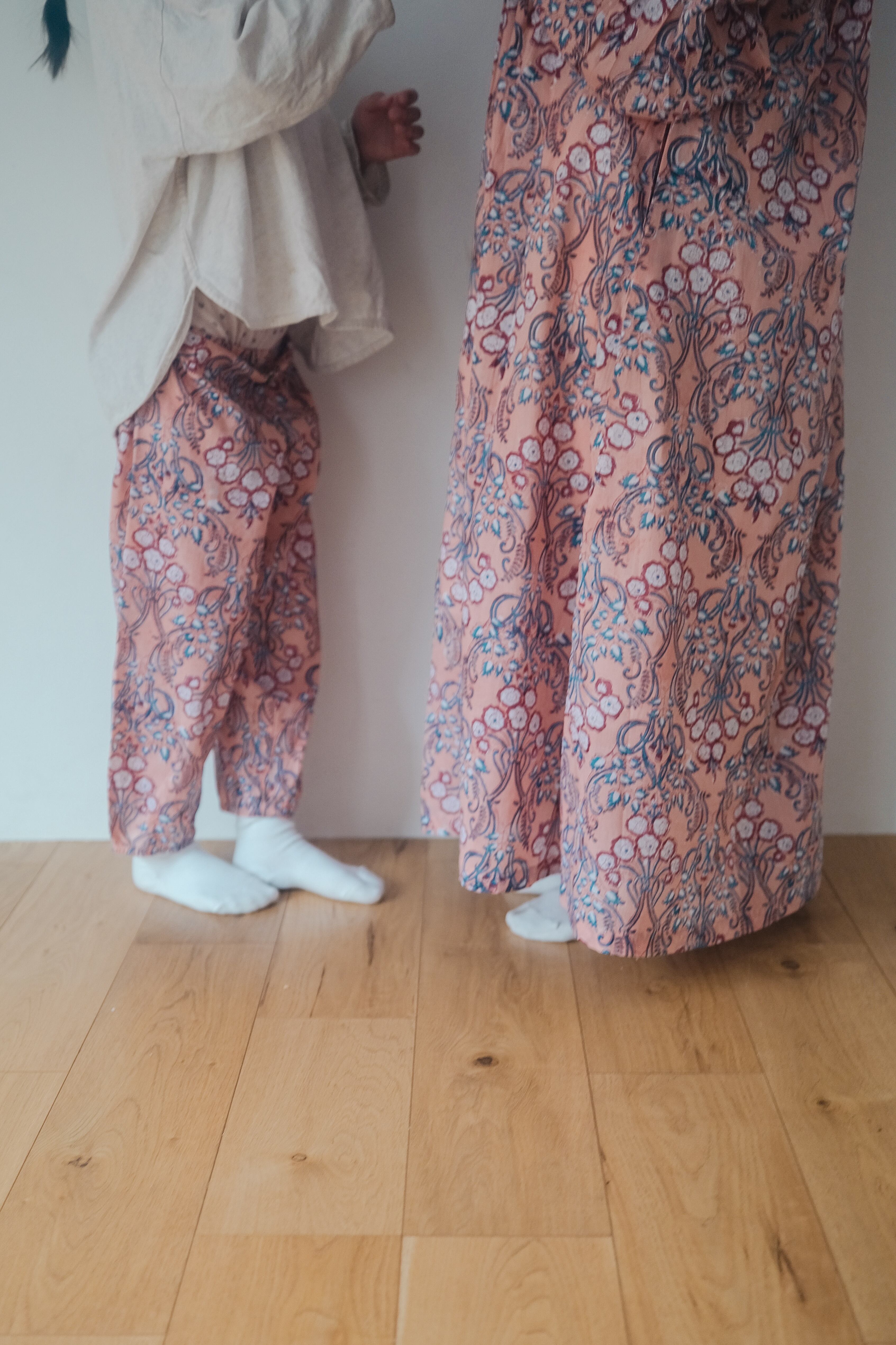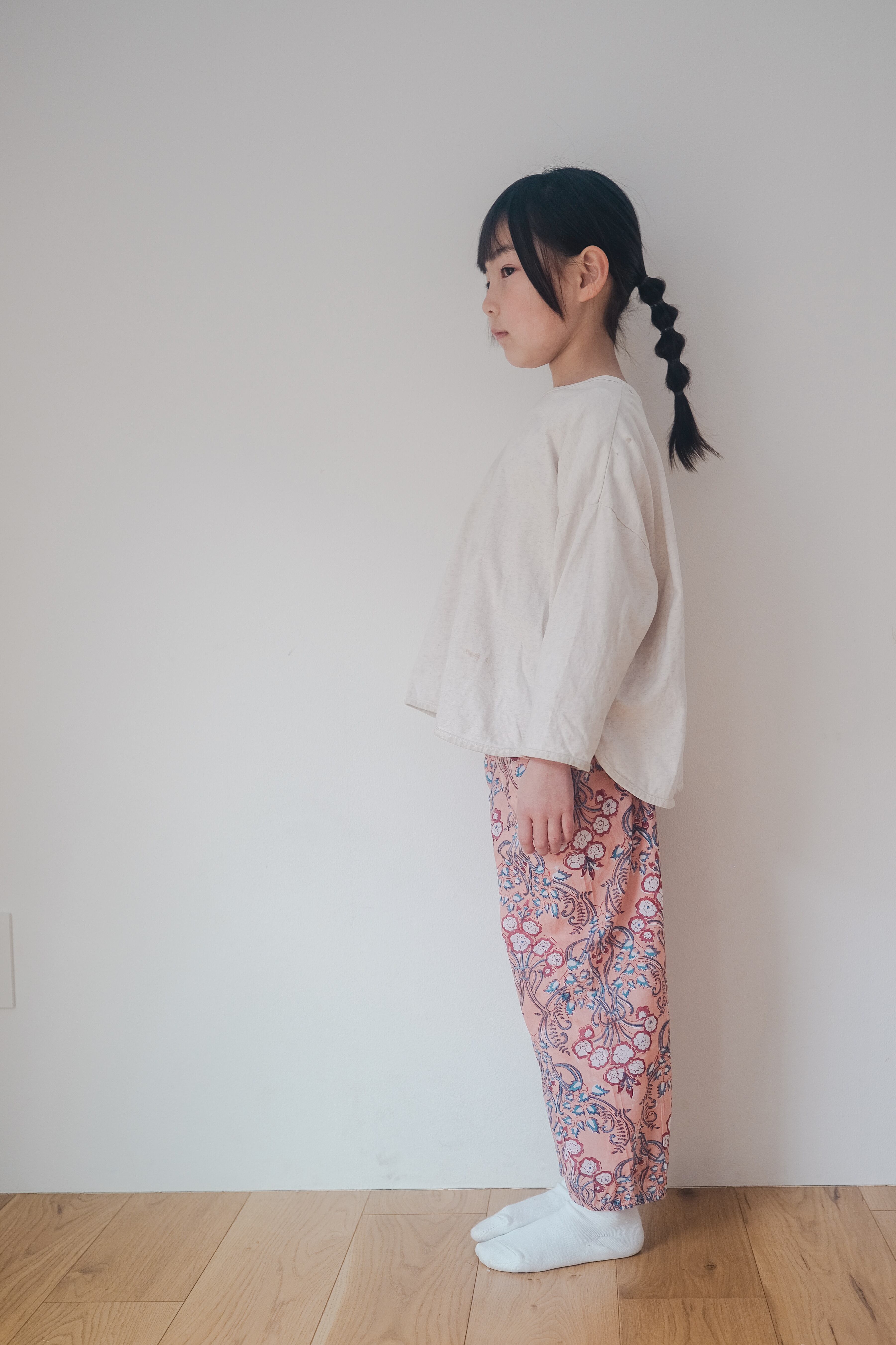 淡いピンクのやわらかな花柄sakuraで仕立てた子どもパンツ。