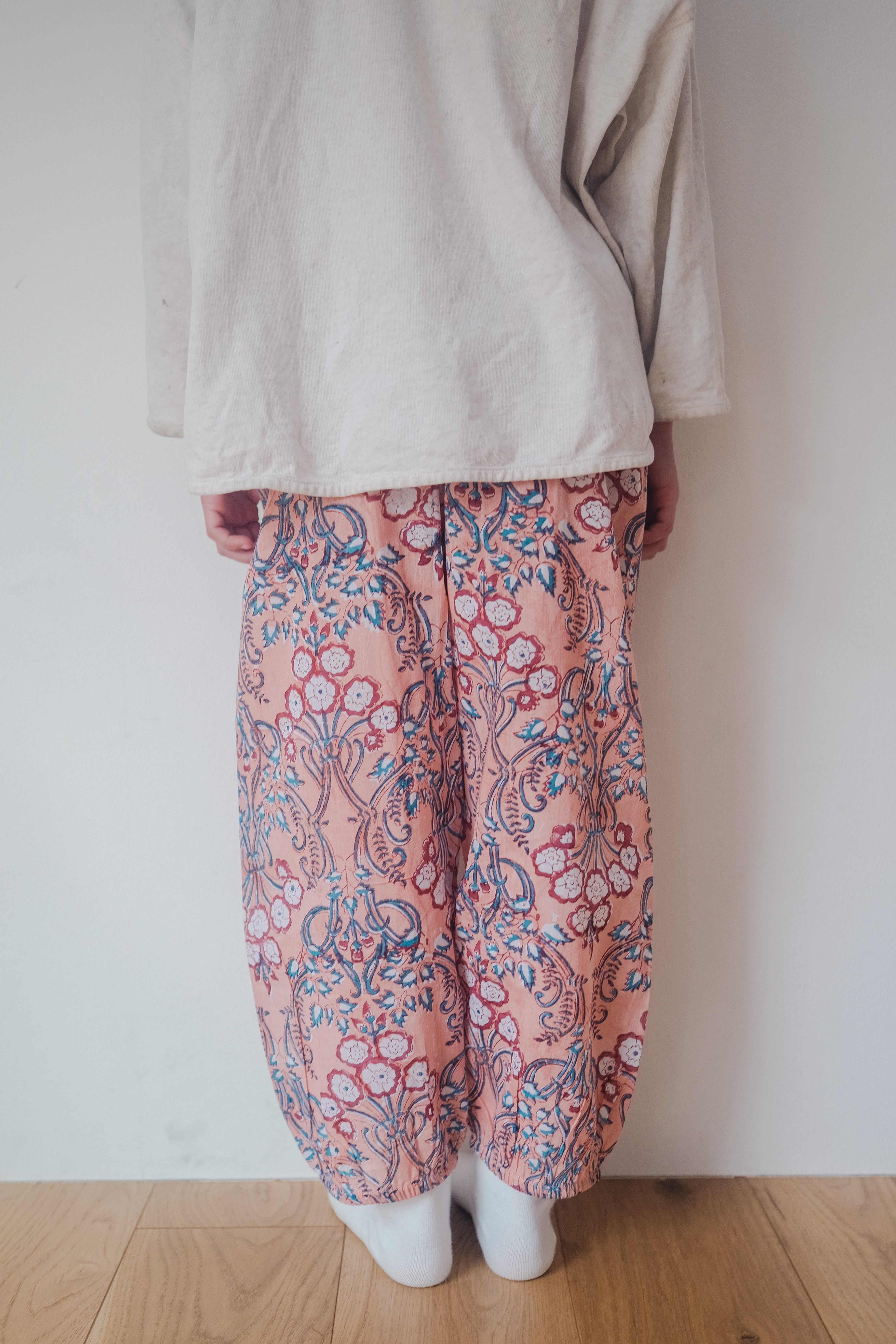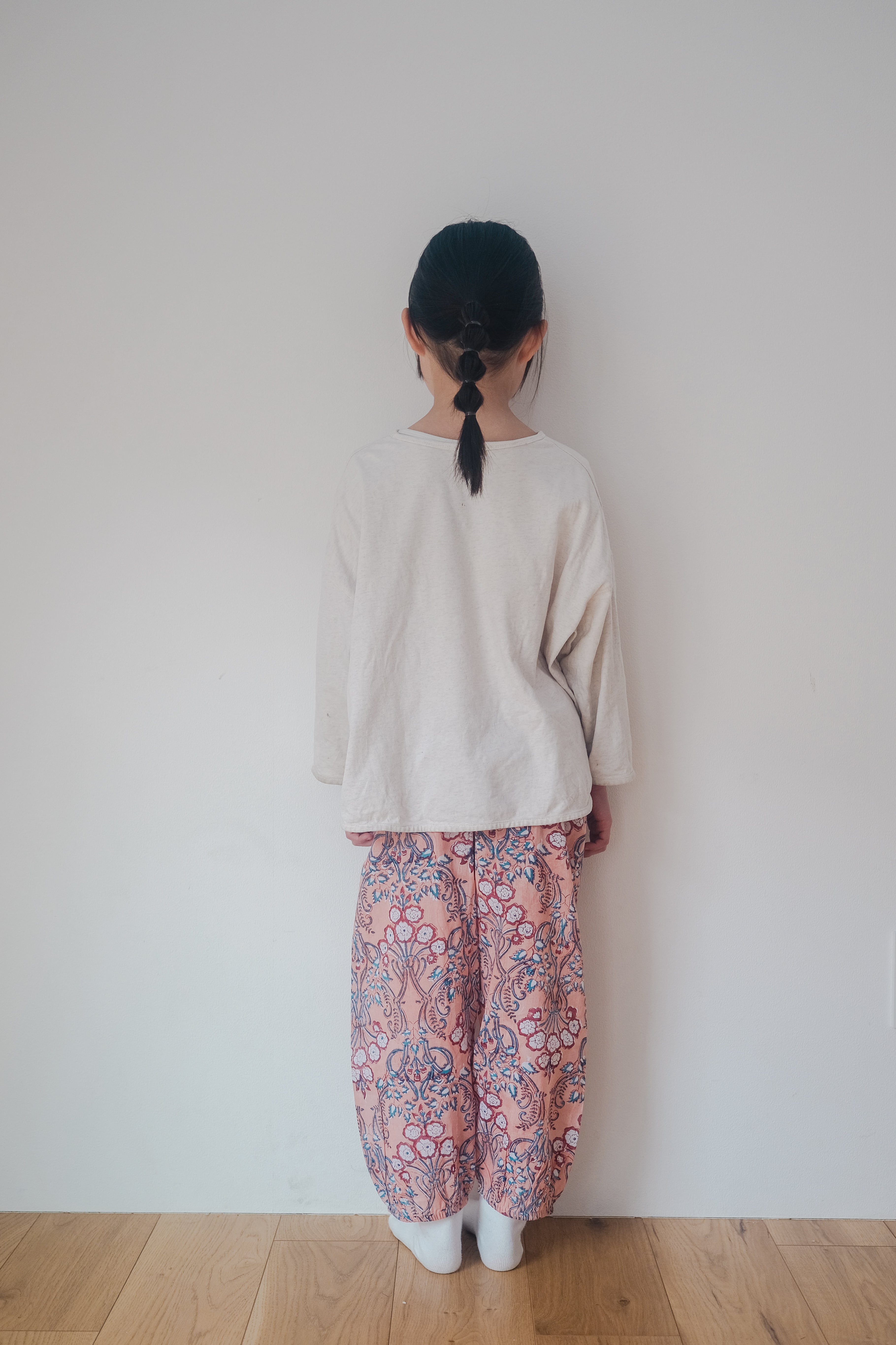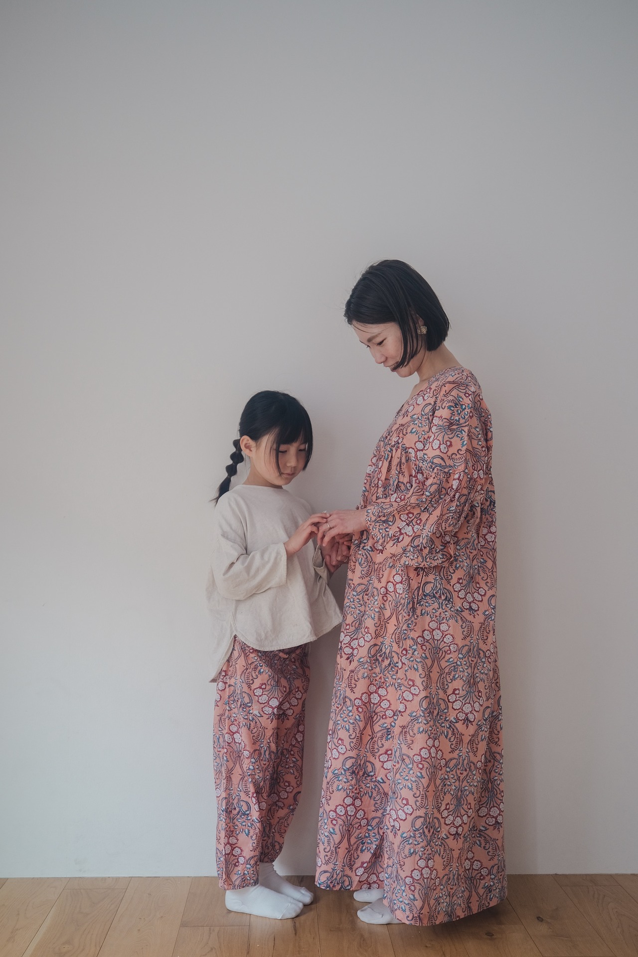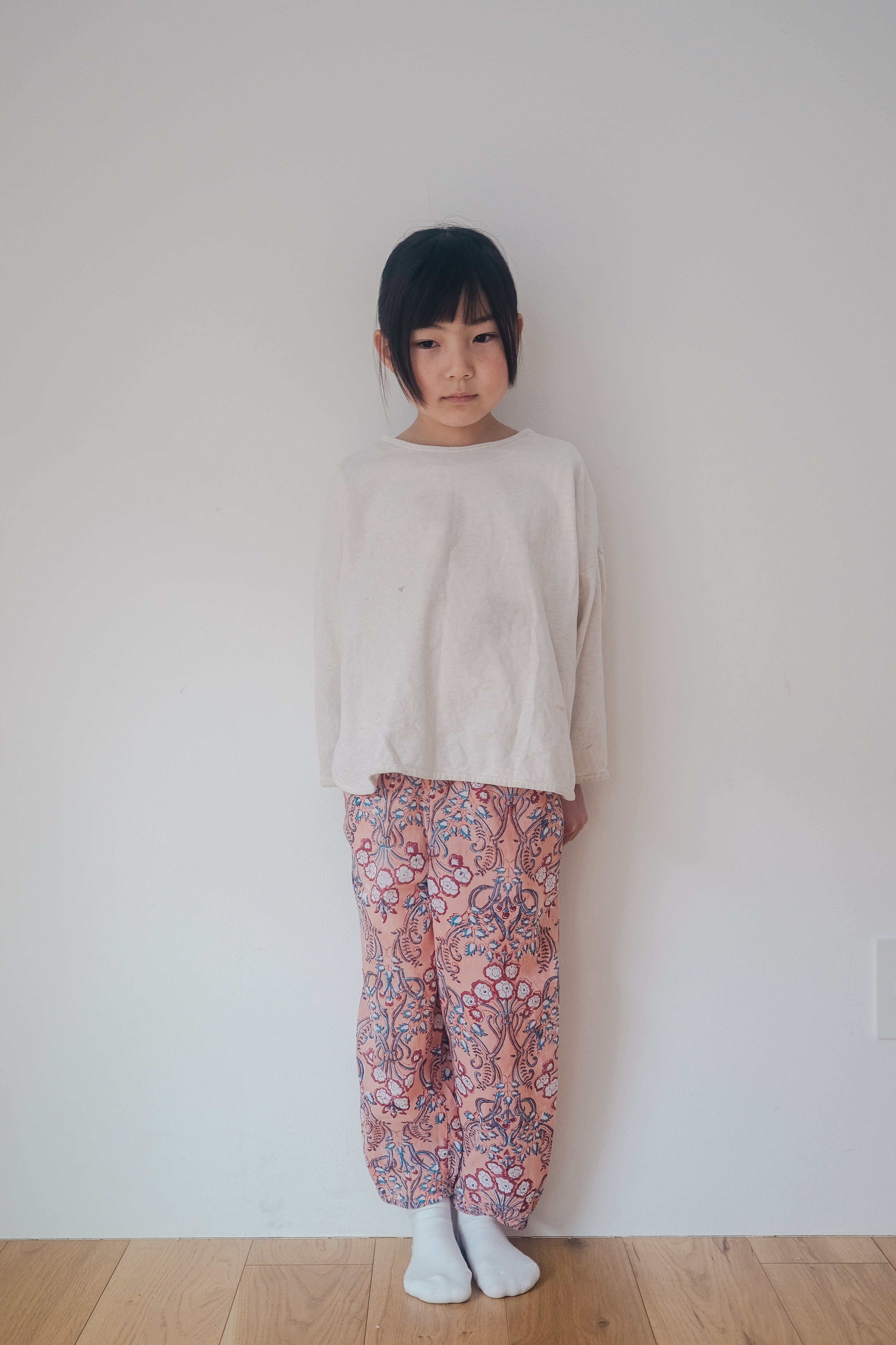 淡いピンクのやわらかな花柄sakuraで仕立てた子どもパンツ。