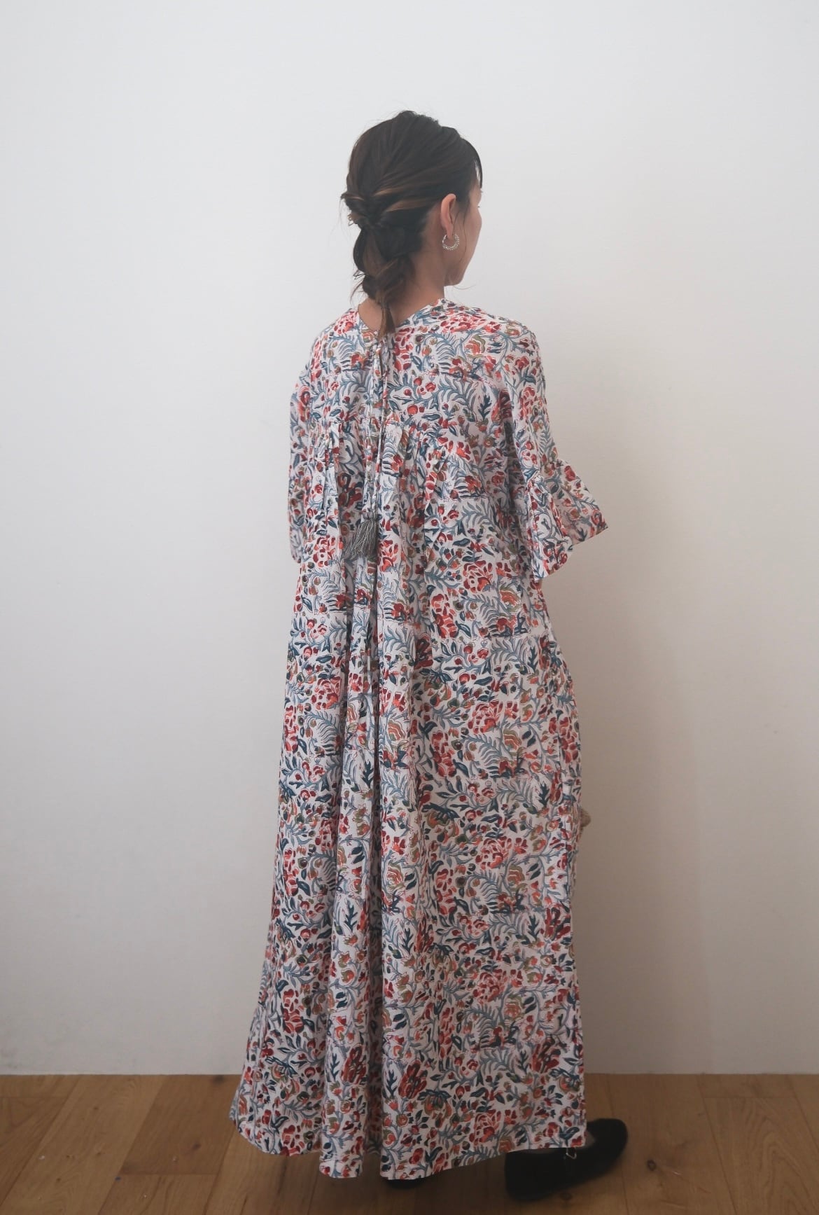 五分丈のフレア袖が手元をやさしく包み、