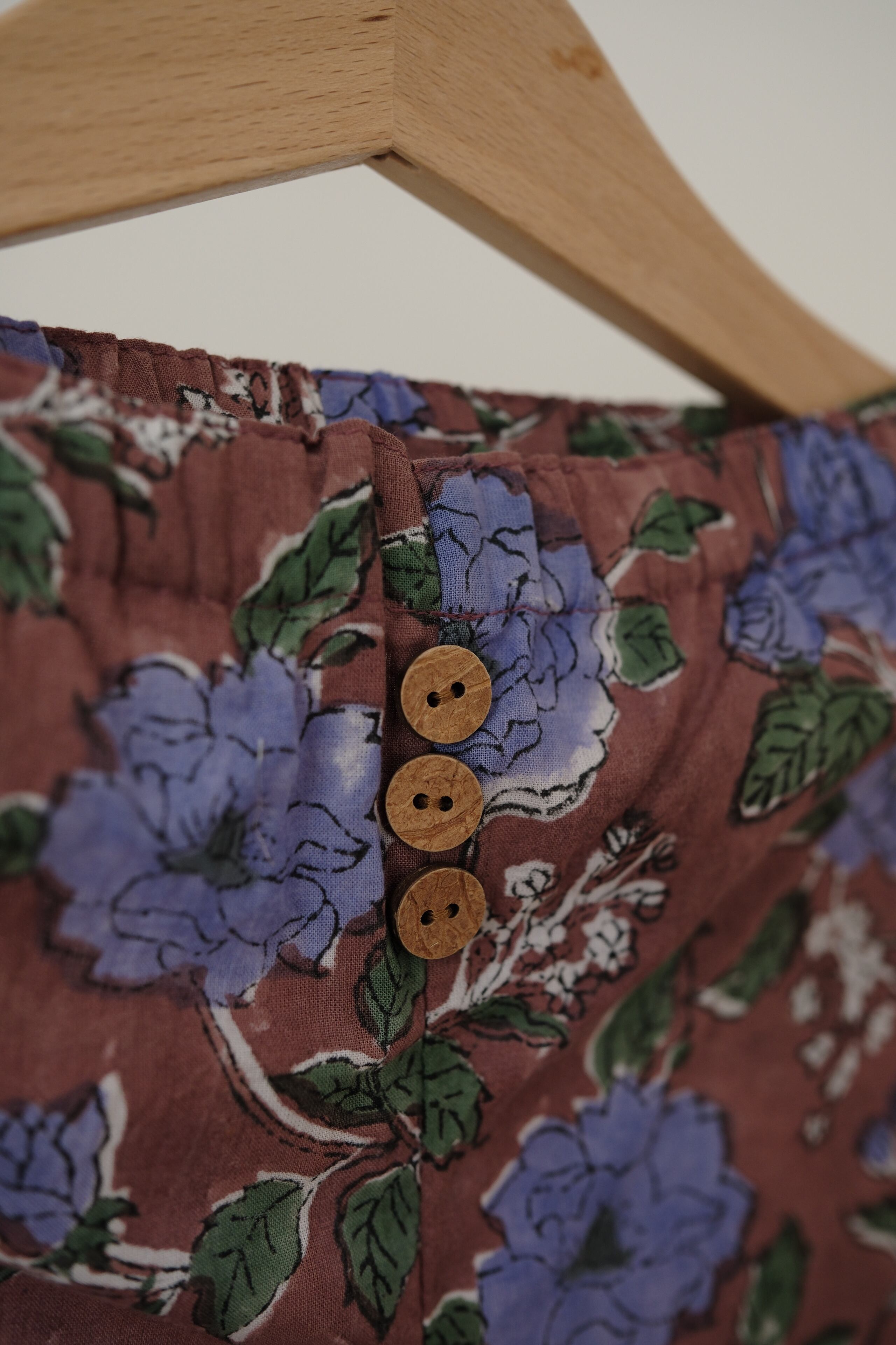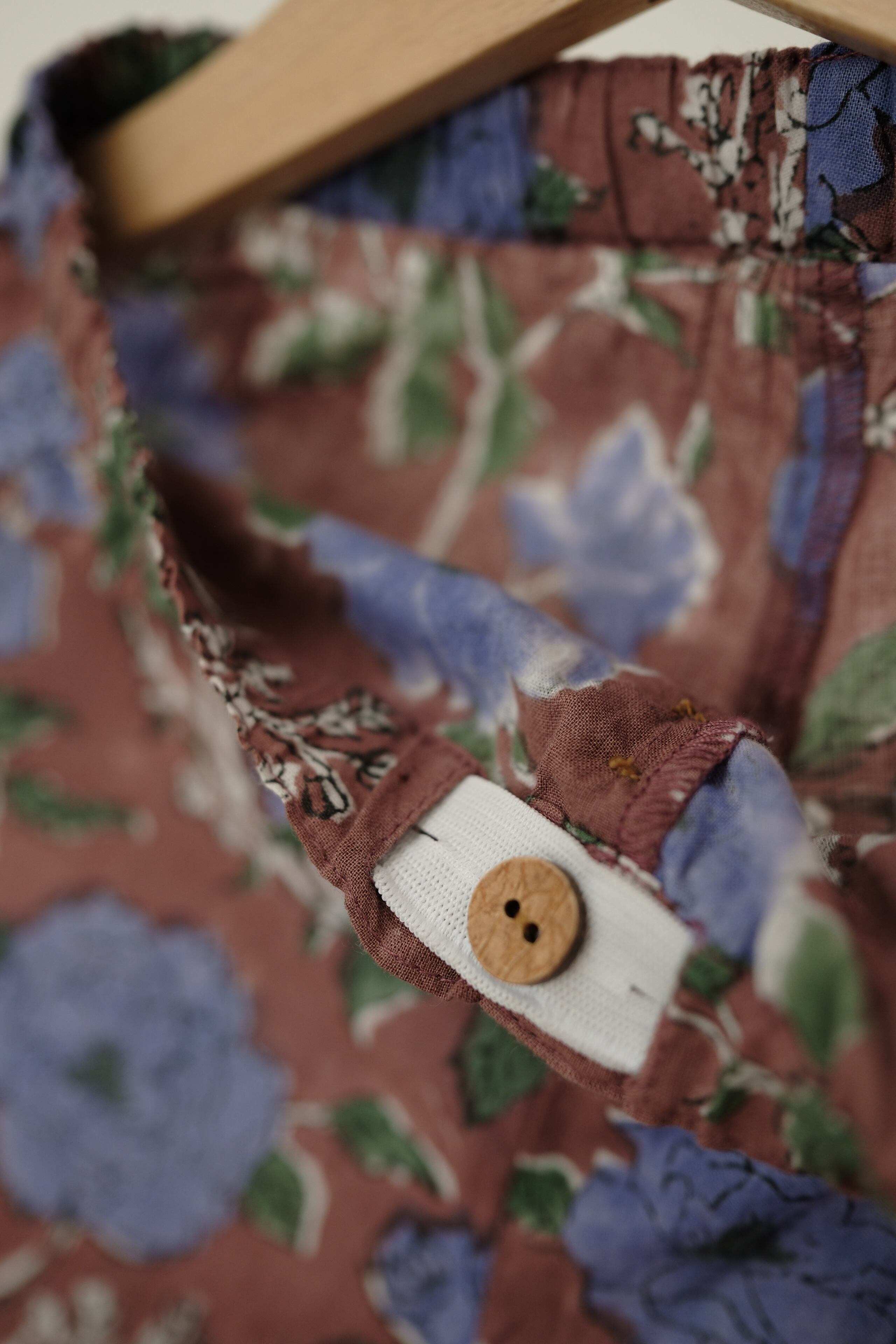 やさしいブラウンの地に、深いブルーの花模様をそっと咲かせた moca。