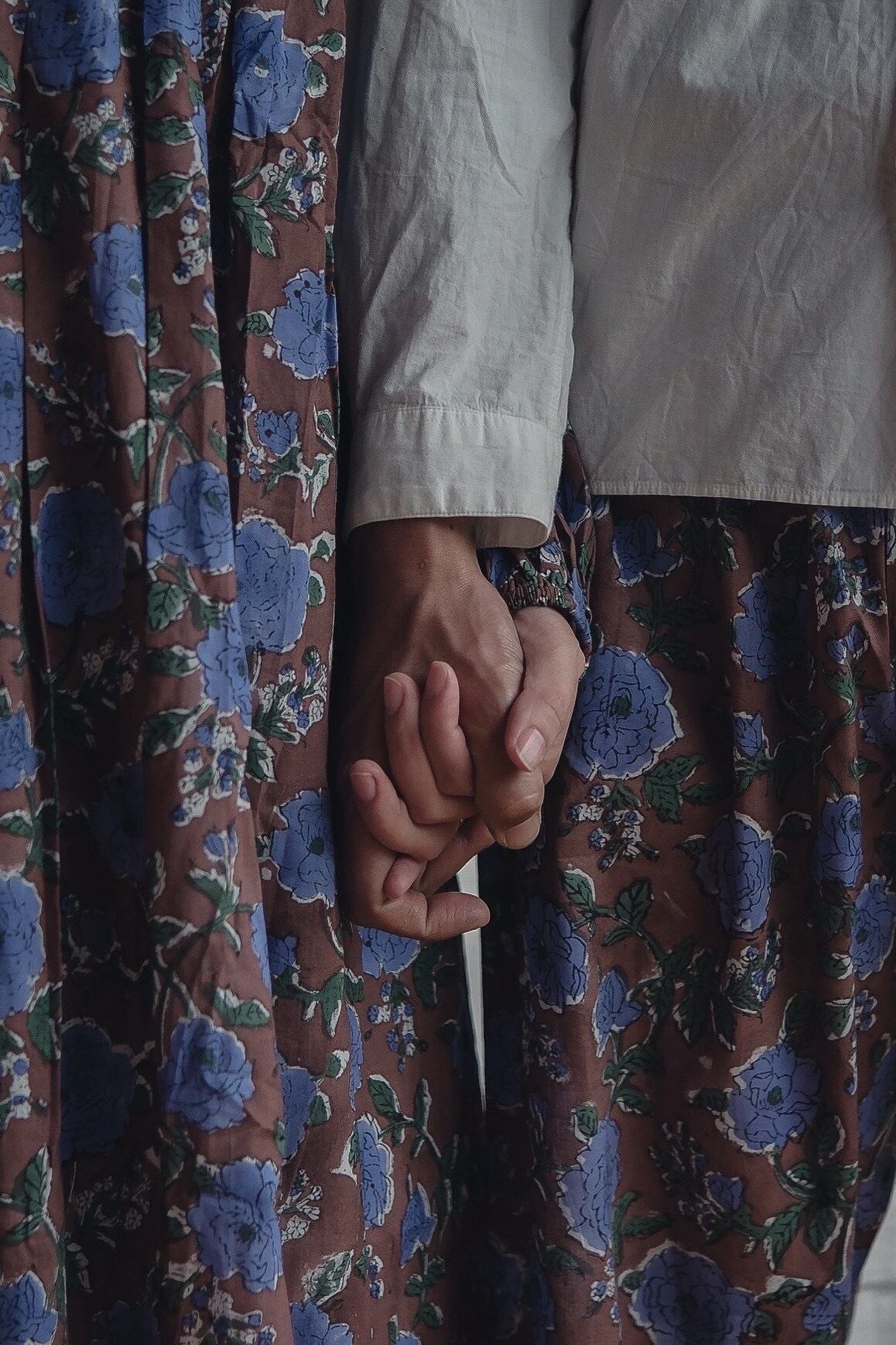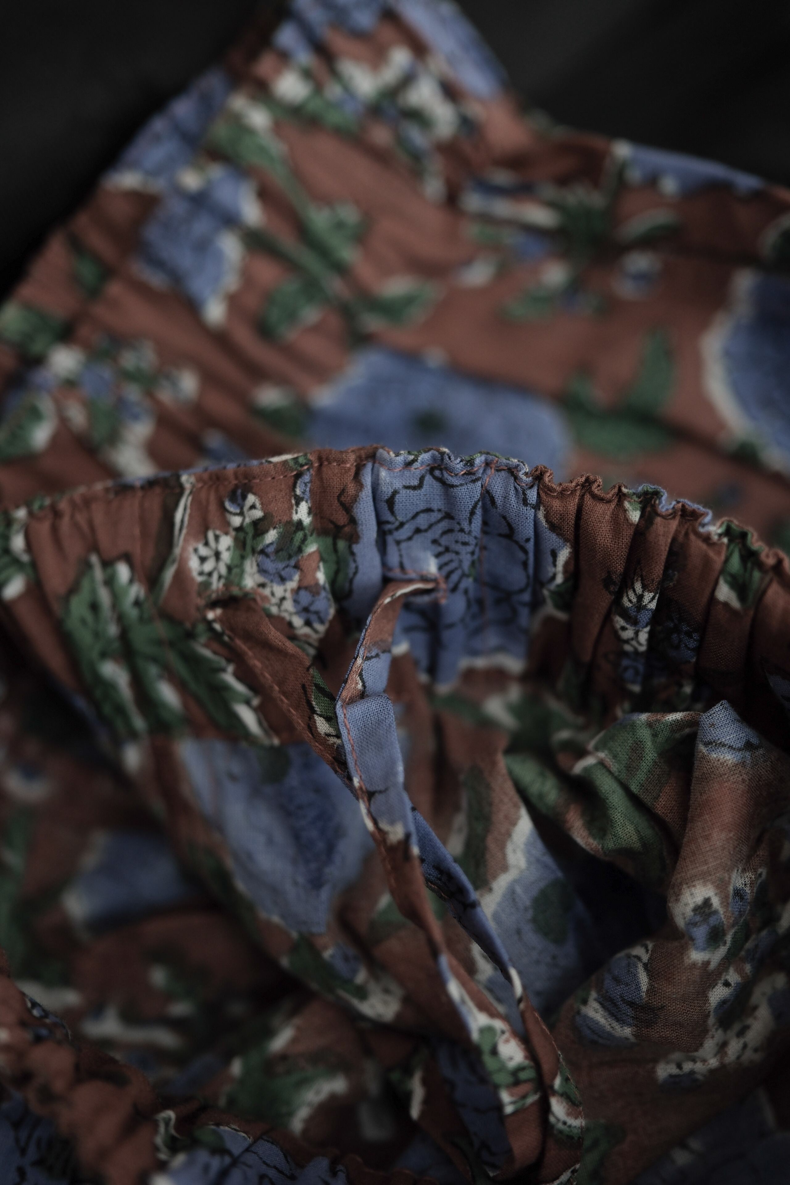 やさしいブラウンの地に、深いブルーの花模様が浮かぶ “moca”。