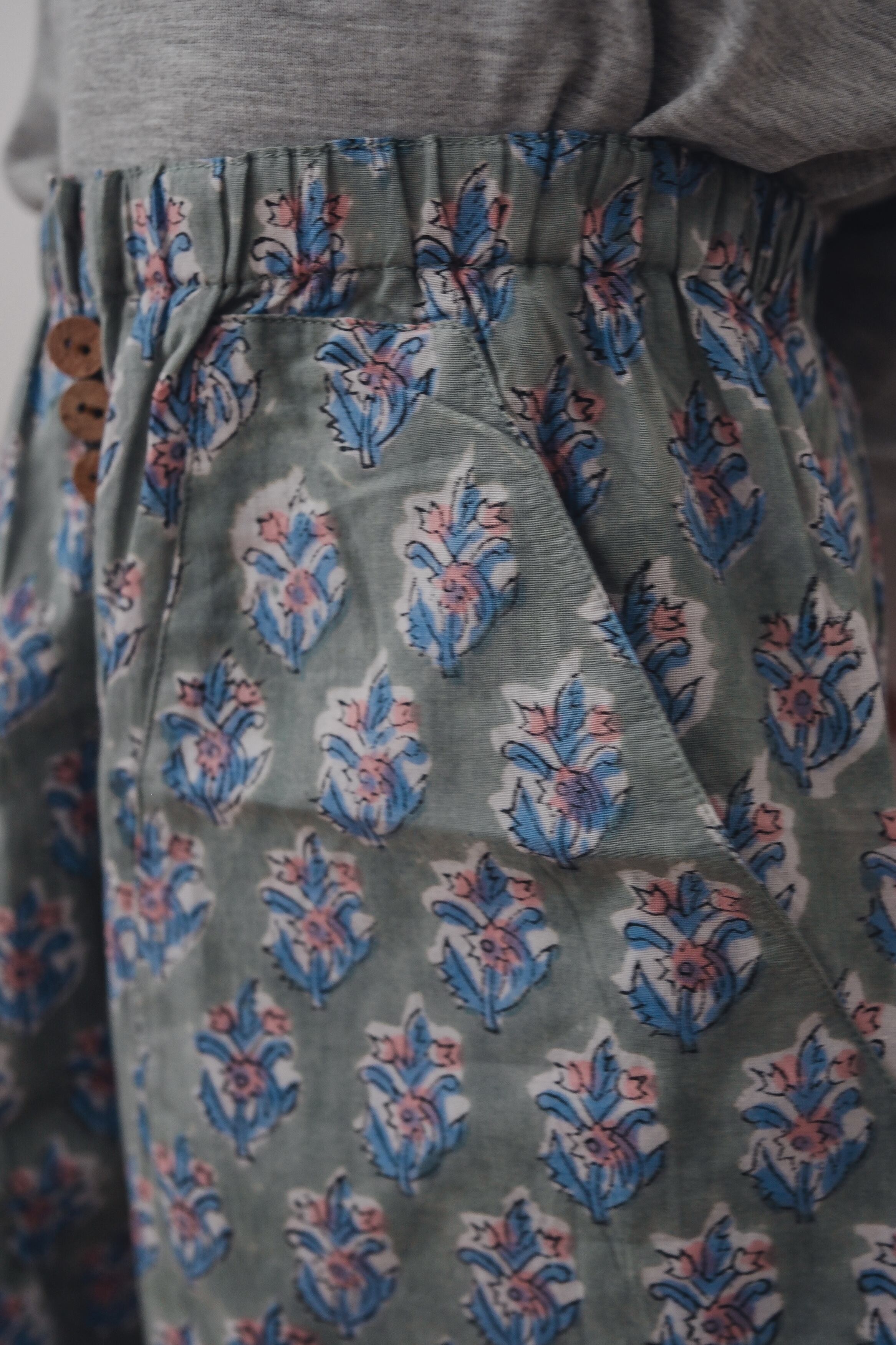 やさしい“くすみグリーン”の地に、小さな花模様