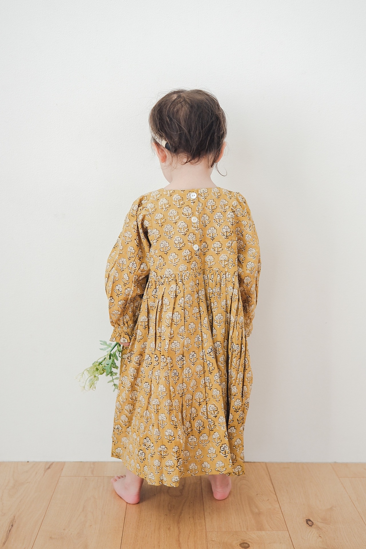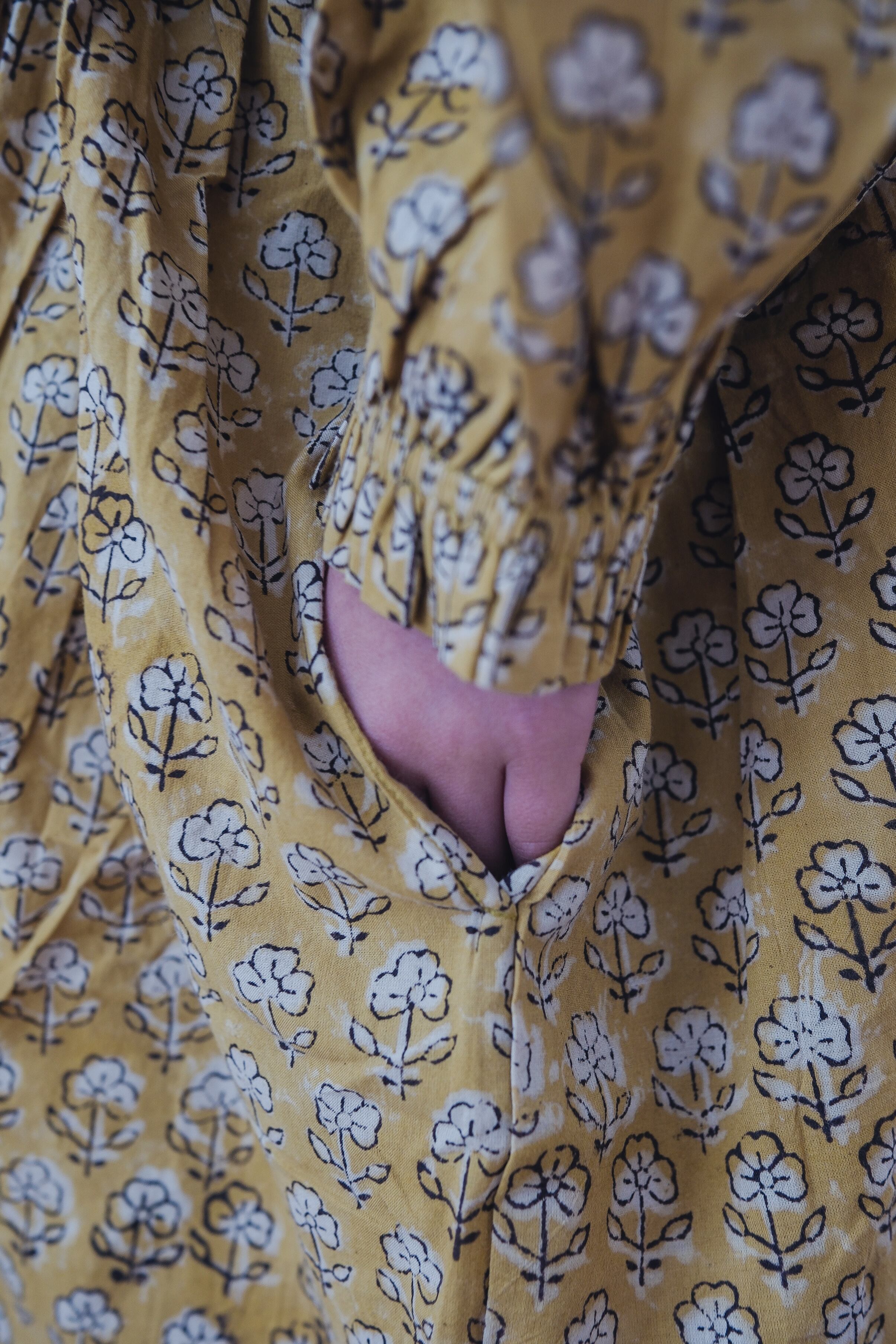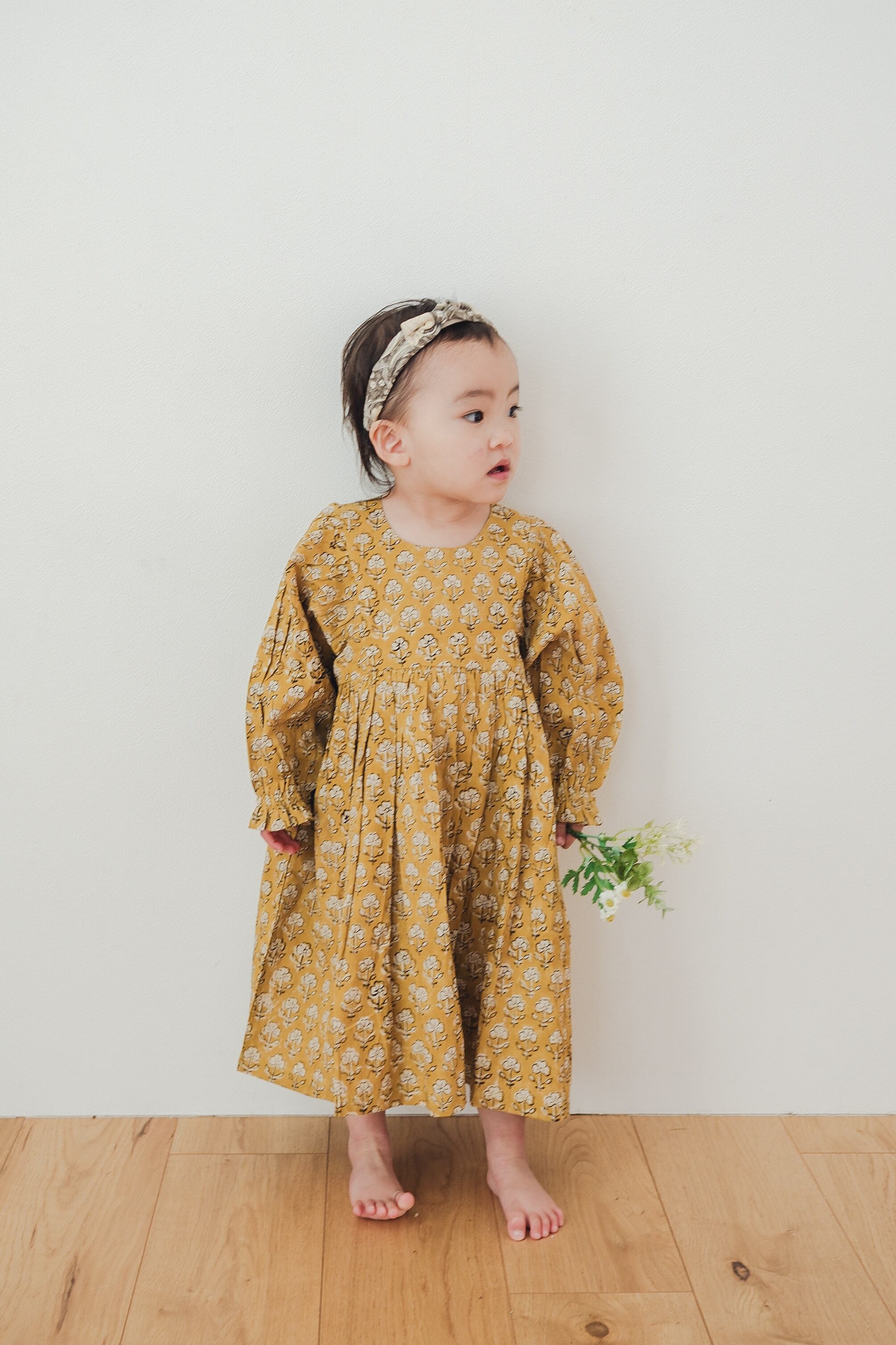 やわらかなマスタードの地に、小さな花模様。